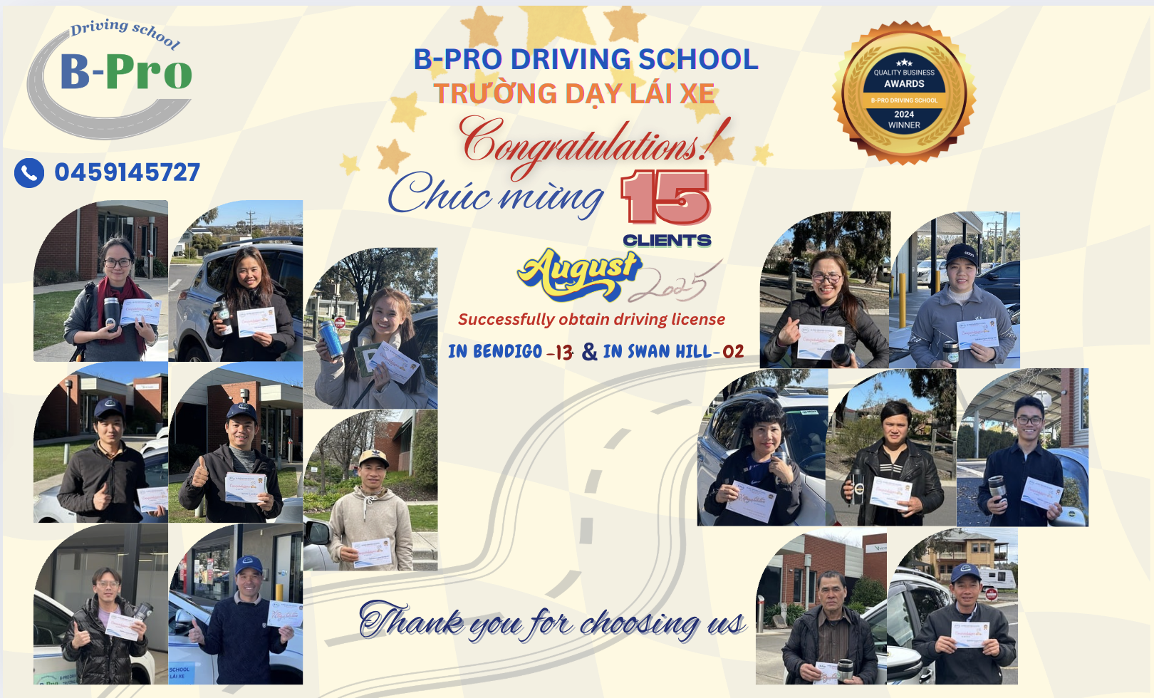 B-Pro Driving School xin trân trọng cảm ơn quí khách hàng đã tin tưởng và chọn chúng tôi cho hành trình lấy bằng lái xe tại Úc.